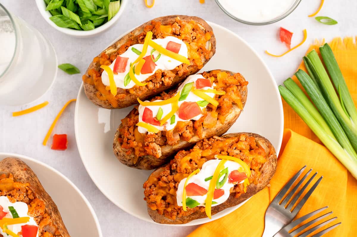 Delicious baked potatoes topped with seasoned ground chicken, cheese, and fresh toppings – perfect for a hearty and flavorful meal.