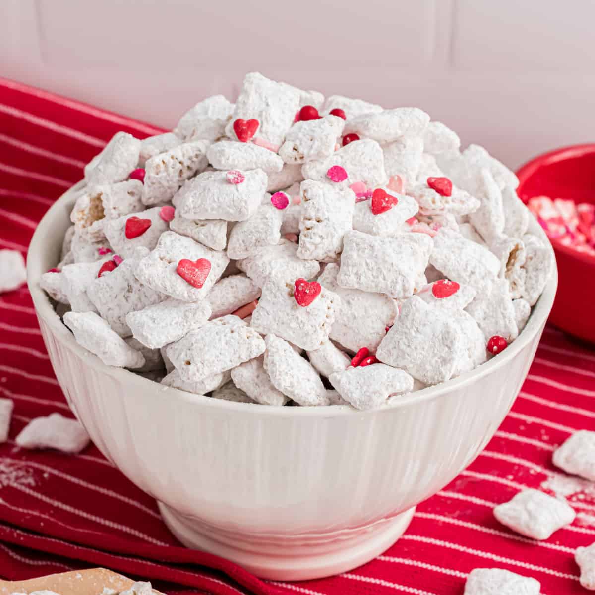 A delicious and colorful cherry puppy chow snack perfect for any occasion.