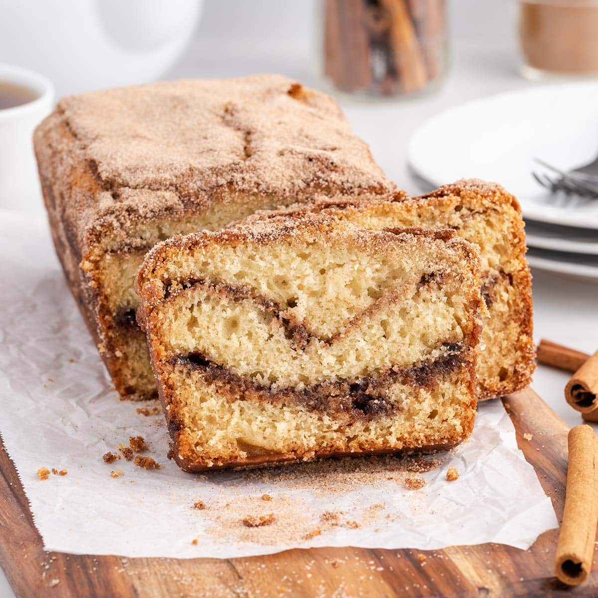 - Repeat with another third of batter and cinnamon sugar. Finish with the remaining batter and sprinkle the top with the remaining cinnamon sugar.